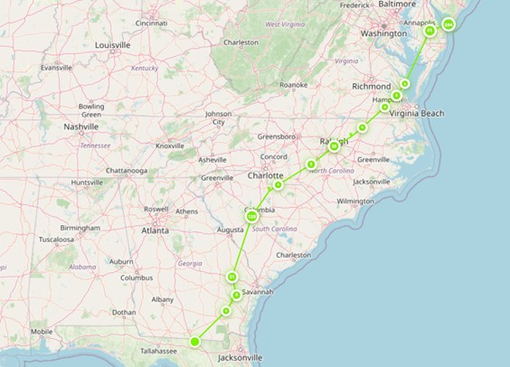 Fanning crossed the Delaware Bay in just over an hour, launching from the Cape May Point Arts & Science Center and then pinging at the Lewes Ferry Terminal in Delaware. From there, Fanning cut through the middle of North Carolina, South Carolina, Georgia, Alabama, Mississippi, and through the top of Louisiana before ending up between Dallas and Austin, Texas. Staying away from the direct coastline was beneficial for Fanning, as it was able to avoid drifting out to sea or being funneled into Florida.
