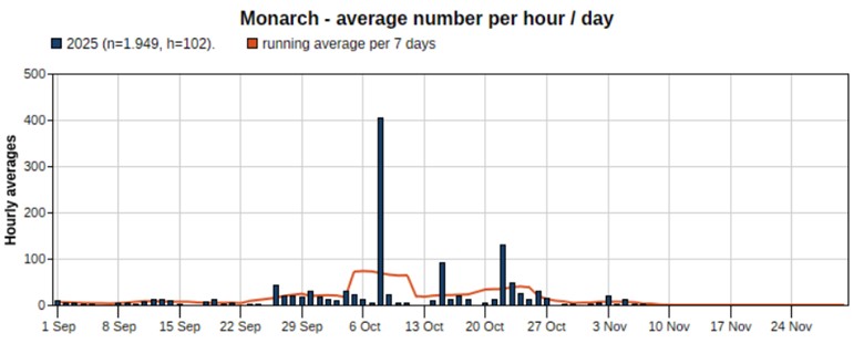 Figure 1. Hourly average Monarch densities recorded during MMP point counts, fall 2025.2025 marked the second year that the MMP conducted stationary point counts. Previously, a driving census was utilized to observe monarch migration through Cape Island. However, issues related to increased tourism and associated road usage, macro- and micro-landscape changes, and general safety concerns all led to the adoption of a new system. Last year, the project switched to stationary point counts from the Coral Avenue dune crossover at Cape May Point. These counts emulate the structure of other CMBO migration counts. The thirty-minute counts are initiated at exactly two, five, and eight hours after sunrise, from September 1 to November 7, and are uploaded to the global migration database Trektellen for public viewing.