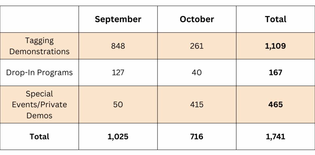 The annual Monarch Fest at NJ Audubon’s Nature Center of Cape May was held on September 28, 2025, and attracted over 1,300 visitors; it was the largest festival yet! The MMP held four tagging demonstrations throughout the day, including one with an ASL Interpreter, Emily Krause. Each program was attended by over 100 guests, with over 500 people in total across all tagging demonstrations. The annual Cape May Fall Birding Festival also provided us with a weekend to represent the MMP at Convention Hall. Over the three days of the festival, in excess of 400 people stopped by our table, and about 45 people were present each day at the 12:00 PM tagging demos at Convention Hall. We were also able to welcome an Environmental Science class from Camden High School to Cape May Point State Park for a conventional tagging and BluMorpho deployment demonstration. We were thrilled to share the science and passion behind this project with 12 students and their teacher.