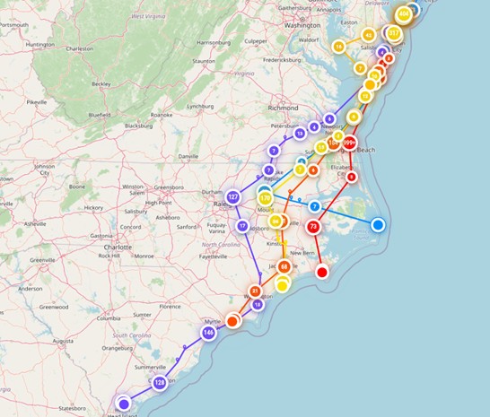 There are many potential applications and new avenues to pursue when considering what we will learn from this new technology. Some Monarchs with BluMorpho tags appeared to take different routes during different parts of the season. Four of the monarchs deployed in late October used the Eastern Shore of Virginia to cut across the Chesapeake Bay over its shortest portions. These monarchs similarly continued down the coast, eventually getting pushed out to the barrier islands of North Carolina. During the first week of November, coastal North Carolina experienced a low-pressure weather system that brought thunderstorms and strong winds. These conditions potentially contributed to similar tracks for all four individuals.